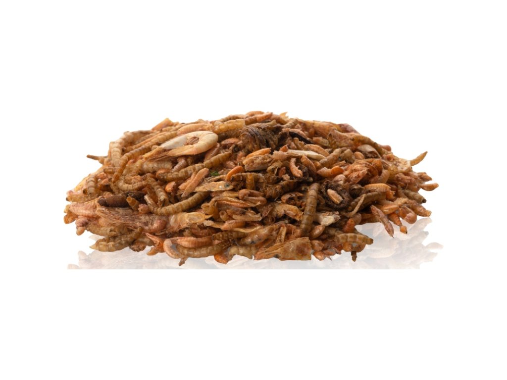 Gammarus, bourec morušový, moučný červ, krevety, rybičky.