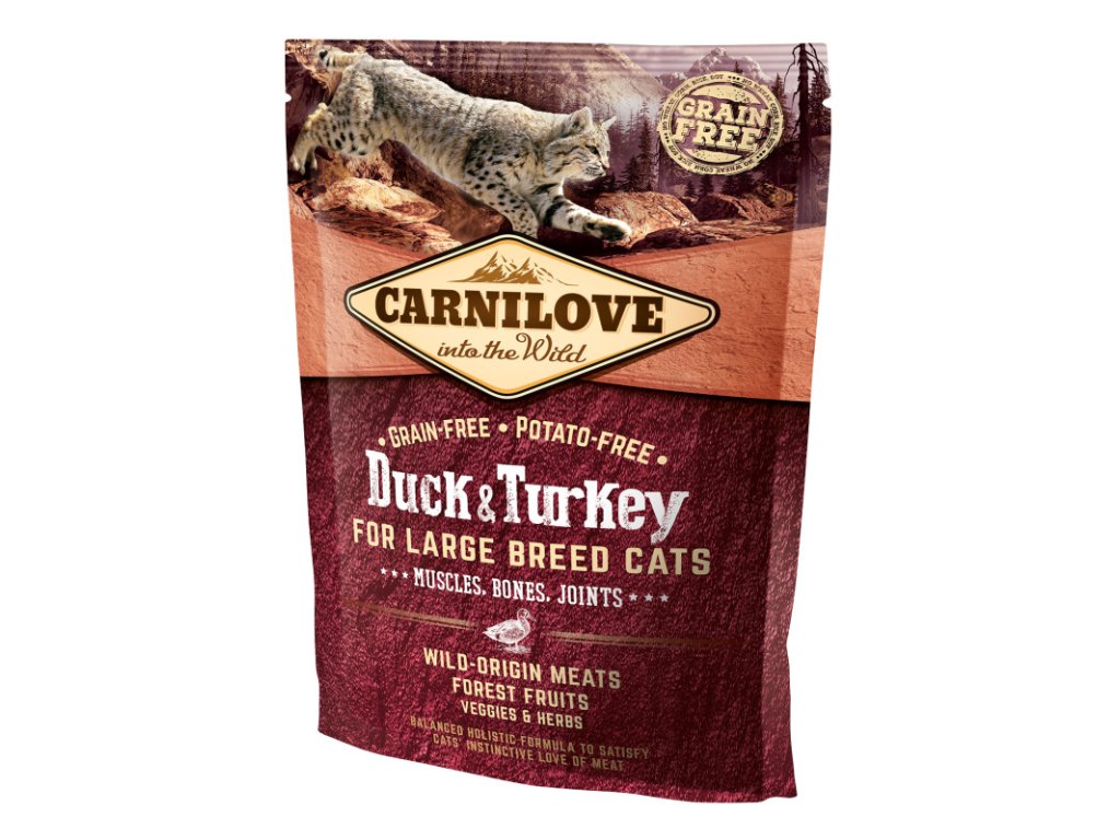 Carnilove Duck & Turkey for Large Breed Cats Muscles, Bones, Joints - holistické krmivo pro perfektní kondici svalů, kostí a kloubů velkých koček, např. Mainská mývalí, Americký bobtail, Ragdoll, Savanová kočka, Chausie, Sibiřská kočka, Norská lesní kočka, Ocicat.