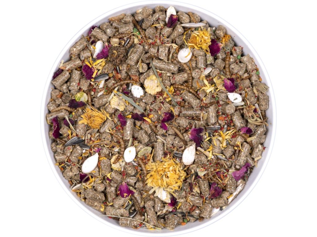 Ječmen (19 %), pšeničné otruby (17,2 %), pšenice, celé sójové boby, kukuřice (11,23 %), hrachové vločky obohacené vitamínem C, karobové lusky, mrkev (2,5 %), bílý oves, černý oves, špalda, řepná dužina (2 %), sójový olej, larvy potemníků (Tenebrio molitor – 1,4 %), uhličitan vápenatý, echinacea, slunečnicová semena žíhaná, dýňová semena, měsíček, okvětní lístky růží, lněné semeno, monokalcium fosfát, směs ovoce (0,5 %) (kokos, banán, jablko, pomeranč), semínka mastňáku, vaječný prášek (0,2 %), chlorid sodný, celá slunečnicová semena, pivovarské kvasnice (zdroj mannan-oligosacharidů, 0,12 %), dobromysl, agávový inulin, tymián, máta, skořice, kurkuma.