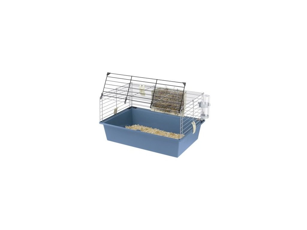 Klec má tradiční konstrukci s plastovou základnou, která tvoří úkryt a jejíž součástí je i miska na krmení. Dveře na přední straně mohou být zcela otevřené pro snadné čištění. Součástí klece jsou i jesle na seno a napaječka.