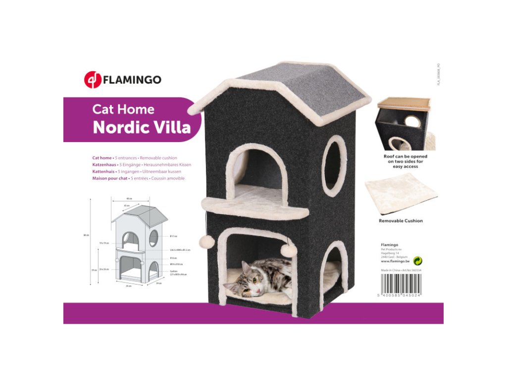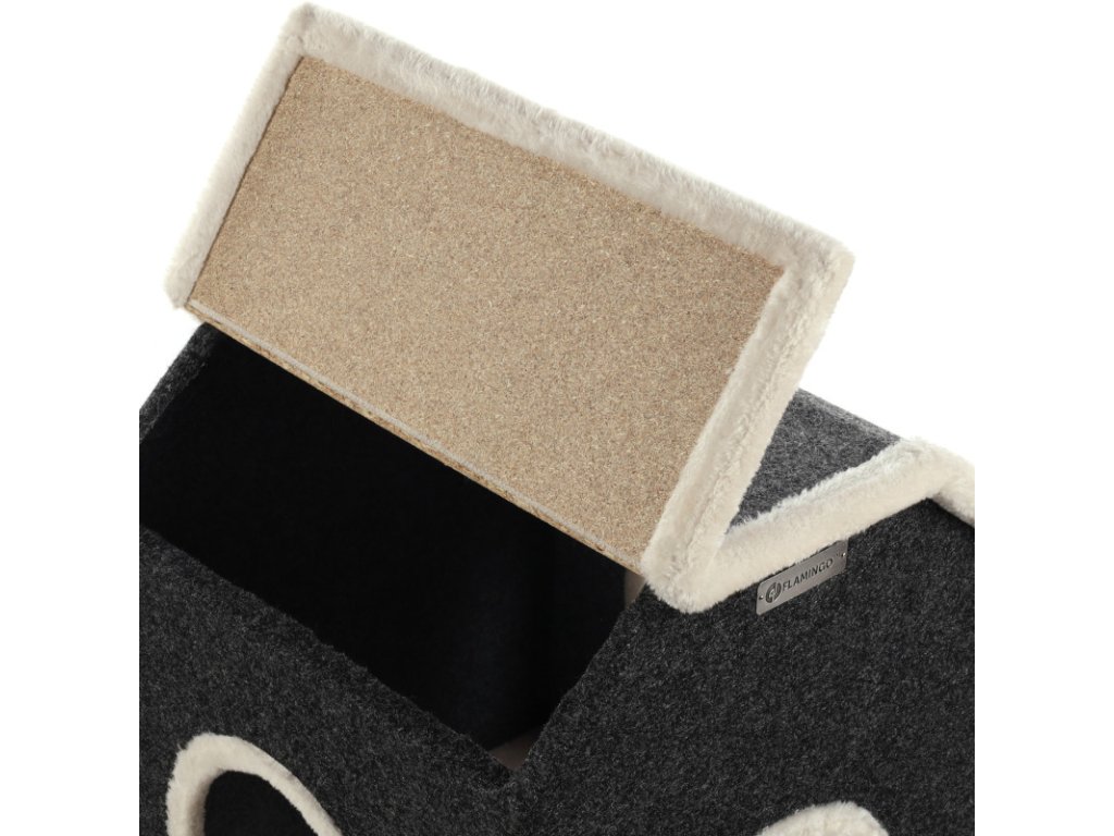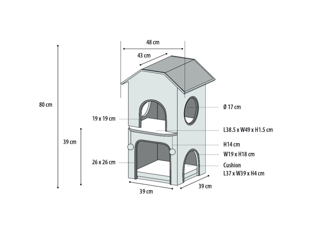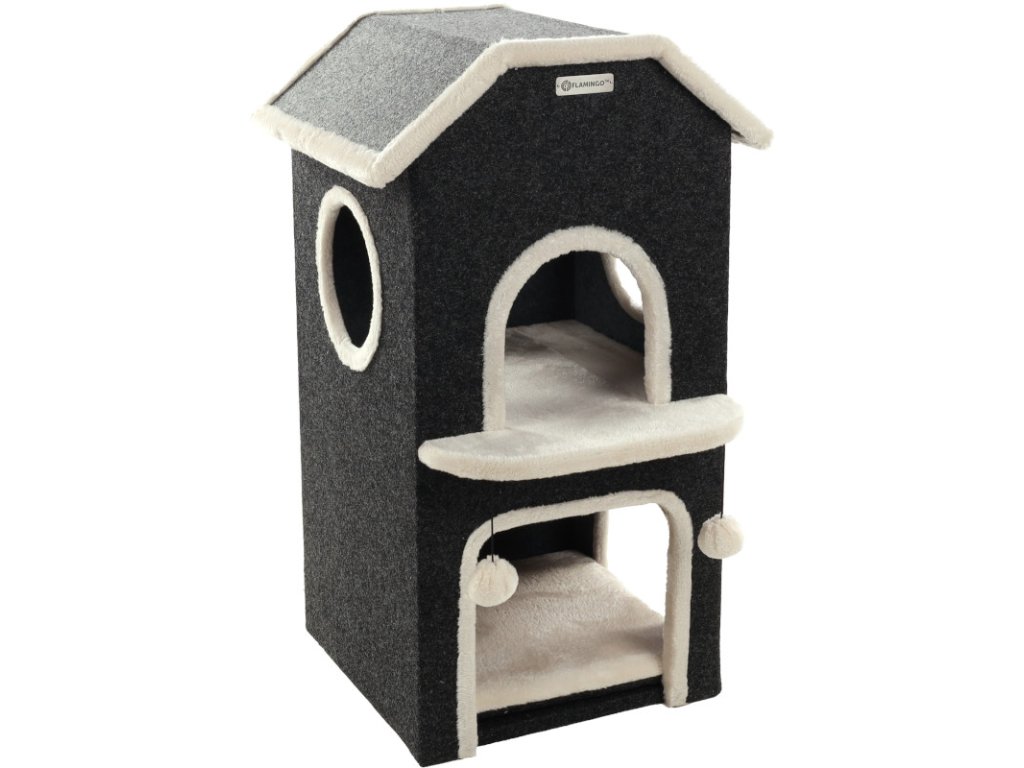 Domek s dřevotřískovou konstrukcí potaženou plstí a plyšem nabízí kočkám ve dvou patrech dvě útulná a klidná místa k odpočinku. Domek má odklopnou střechu, vyjímatelný polštář a pro hravé povahy dva míčky zavěšené na provázcích.