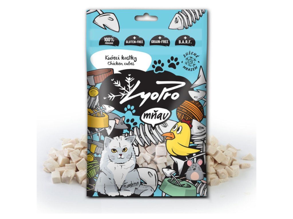 Voňavé kuřecí maso si díky šetrnému sušení mrazem (lyofilizaci) zachovává své aroma, strukturu i plnou chuť, kterou kočky milují. Při lyofilizaci neprochází maso vysokými teplotami, a proto si uchová maximum vitamínů, minerálů a nutričně hodnotných látek. Jde o ideální volbu pro BARF (krmení syrovou stravou), kočičí alergiky a celiaky. Další výhodou sušení mrazem je dlouhá trvanlivost. Kuřecí kostky obsahují 100 % kuřecího masa bez přidané chemie, obilnin, konzervantů a jiných balastních látek. Jde tak o zdravou, lehkou a výživnou odměnu.