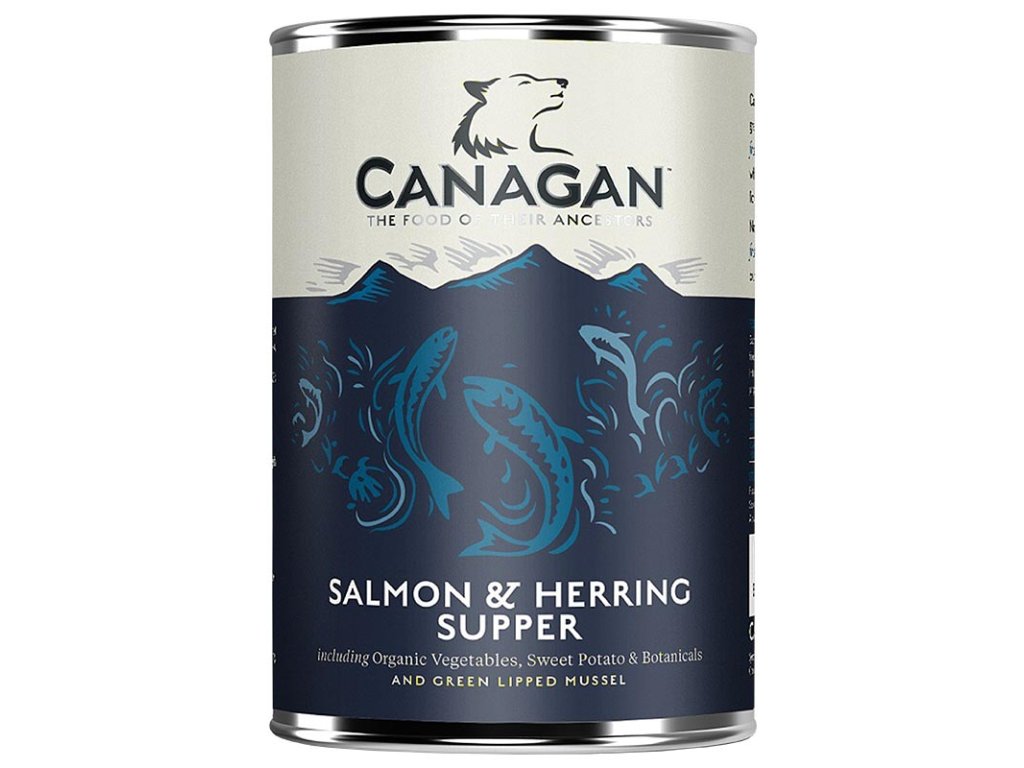 Šťavnatá masová konzerva Canagan Salmon & Herring Supper. Večeře s lososem a sleděm v receptuře bez obilovin - kompletní krmivo pro dospělé psy.