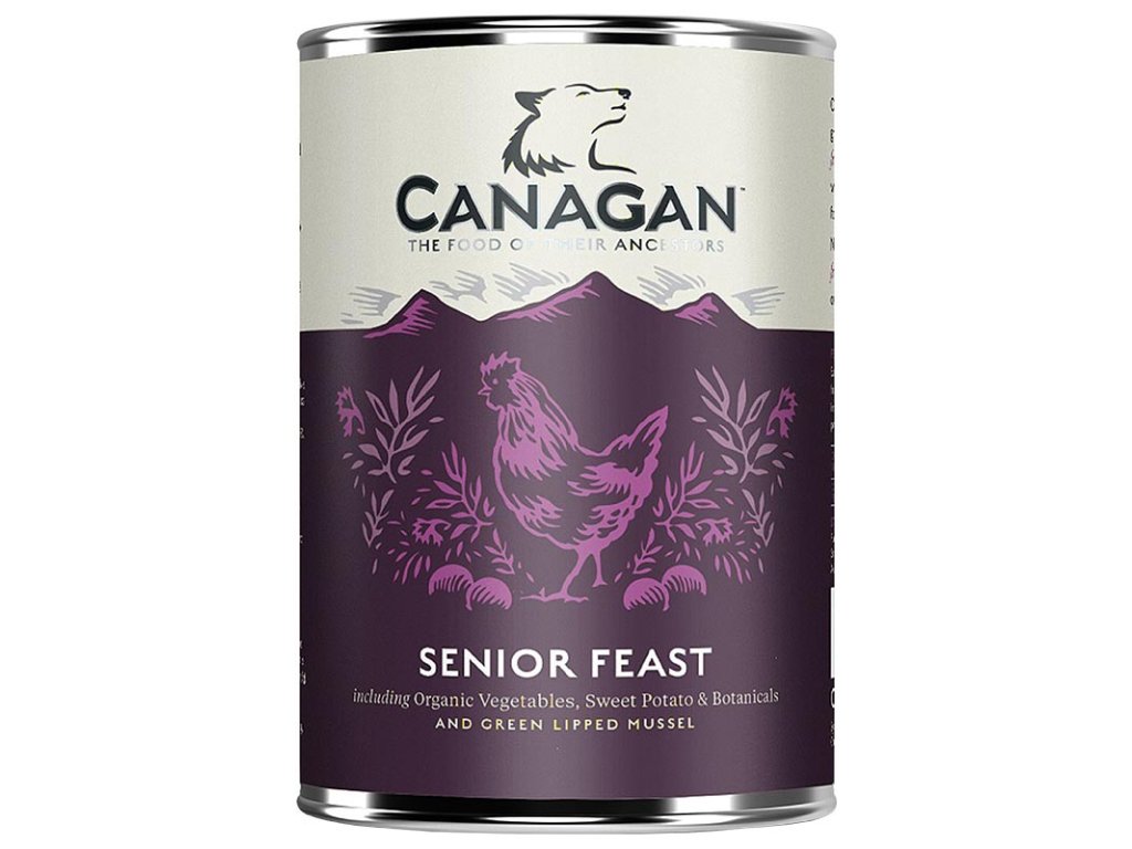 Šťavnatá masová konzerva Canagan Senior Feast. Hostina pro psí seniory v receptuře bez obilovin - kompletní krmivo pro starší dospělé psy.