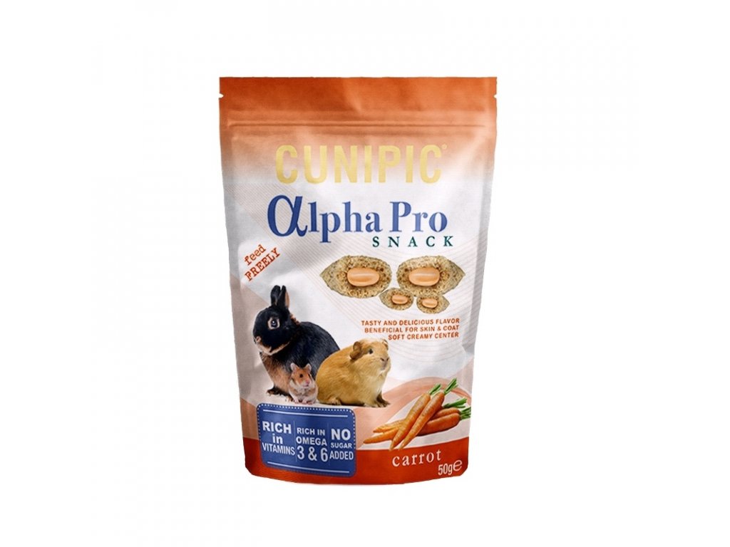 Cunipic Alpha Pro Snack Carrot - křupavé plněné polštářky s mrkví. Zdravý a velice chutný pamlsek pro drobné savce. Lehce křupavý na povrchu a s jemnou krémovou mrkvovou náplní uvnitř. Vysoký obsah vitamínů, Omega 3 a 6 mastných kyselin, pomáhá obnovovat kůži a srst.
