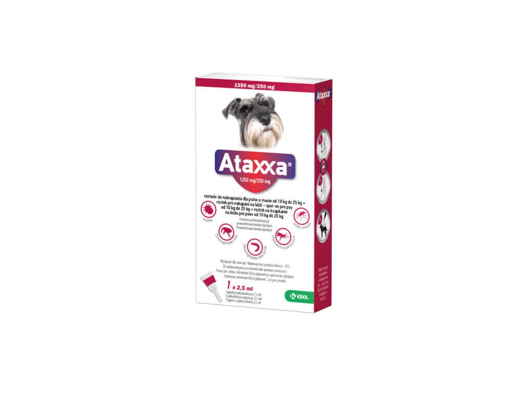 Ataxxa pro psy od 10 do 25 kg spot-on je veterinární léčivý přípravek vhodný pro léčbu a prevenci infestace blechami. Blechy na psech jsou zabíjeny během jednoho dne po aplikaci. Jednorázová aplikace chrání před dalším napadením blechami po dobu 4 týdnů.
