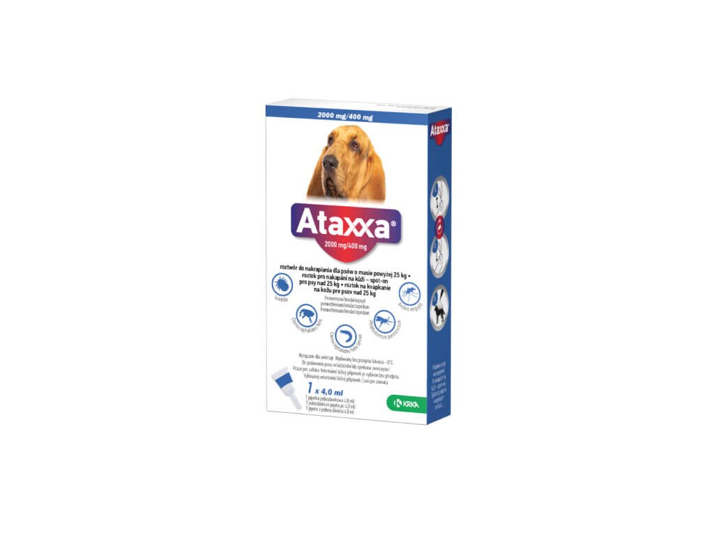 Ataxxa pro psy nad 25 kg spot-on je veterinární léčivý přípravek vhodný pro léčbu a prevenci infestace blechami. Blechy na psech jsou zabíjeny během jednoho dne po aplikaci. Jednorázová aplikace chrání před dalším napadením blechami po dobu 4 týdnů.