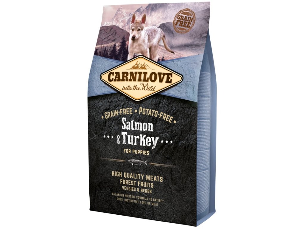Granule Carnilove Salmon & Turkey for Large Breed Puppy jsou superprémiové, holistické kompletní krmivo pro štěňata všech plemen (od 4. týdne do 12měsíce). Je vhodné i pro březí a kojící feny. Celých 45% složení tvoří moučka z lososů a krocaního masa. Losos je zdrojem vysoce stravitelných proteinů. Je bohatým zdrojem omega-3 nenasycených mastných kyselin, které pozitivně ovlivňují mentální vývoj, kardio-vaskulární soustavu a metabolismus (snižují obsah krevního cukru). Losos má pozitivní vliv na kvalitu a vzhled srsti a kůže. Krocan je bohatým zdrojem stravitelných proteinů s vysokým obsahem stopových prvků, zejména zinku. Dále obsahuje vitamíny B3 a B6, které ovlivňují činnost mozku, svalový tonus a jsou nezbytné pro zdravý růst. Sacharidy jsou zastoupeny ve žlutém hrachu, tapiok, v jablkách a cizrně.