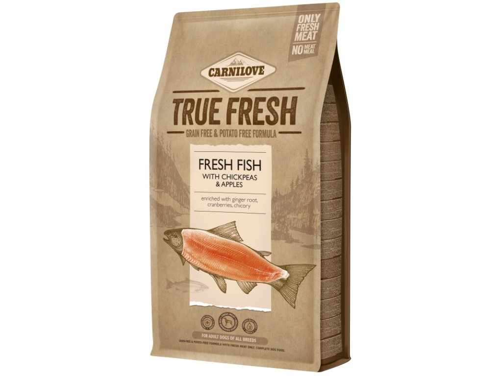 Bezobilné krmivo Carnilove True Fresh s rybou je určeno pro všechny dospělé psy. Nová řada holistických krmiv Carnilove True Fresh neobsahuje obiloviny ani brambory. Krmivo pro psy tedy nese označení Grain-Free a Potato-Free. Základním kamenem ve složení této řady je čerstvé maso. Receptura Fish obsahuje maso z ryb ze Severního moře a ze sladkovodních ryb z jihočeských rybníků. Do složení jsou přidána jablka a cizrna.