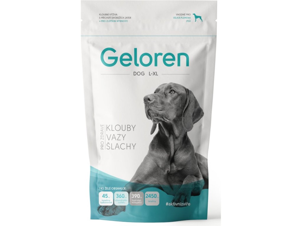 Geloren DOG L-XL - kloubní výživa ve formě žvýkacího pamlsku Geloren DOG je k dispozici ve dvou velikostech pro menší a větší plemena. Navíc ochucena játrovou příchutí, která je pejsky dobře přijímána.
