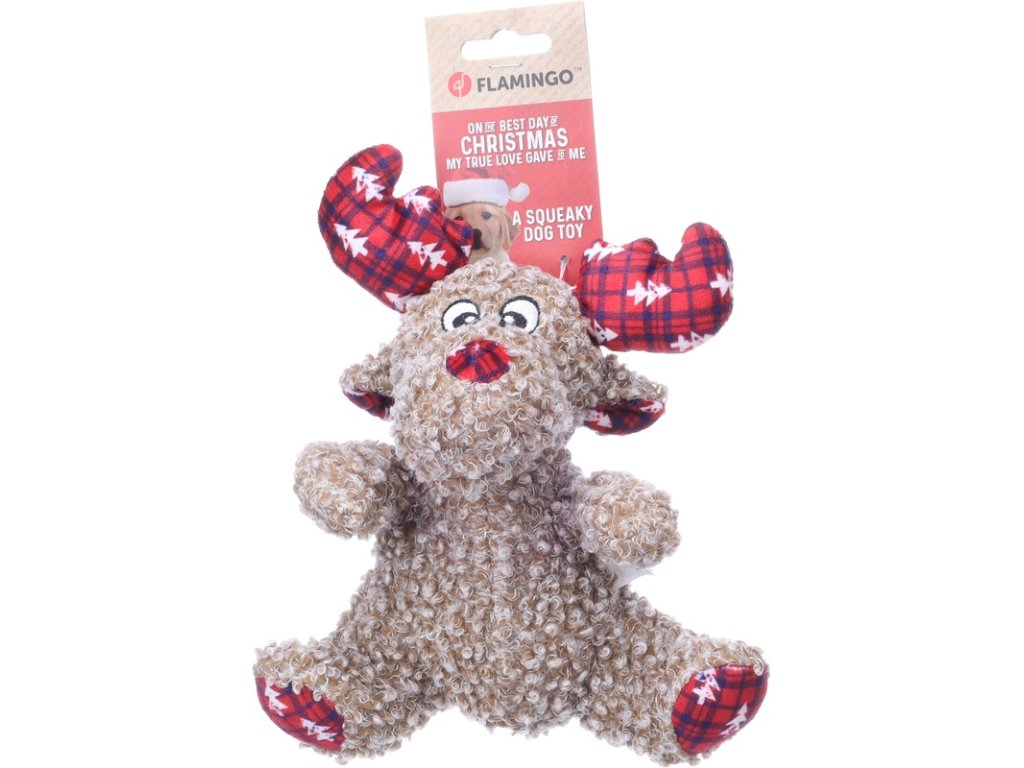 Vánoční hračka pro psy ve tvaru sedícího soba je vyrobena z měkkého plyše. Pro větší potěšení ze hry obsahuje sob pískátko.