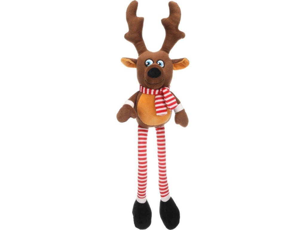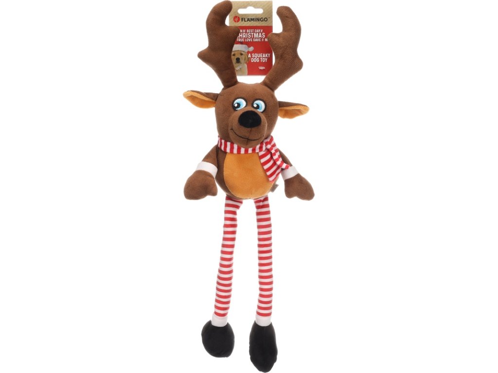 Vánoční hračka pro psy ve tvaru soba s pruhovanou šálou a dlouhým nohama je vyrobena z hebkého plyše. Pro větší potěšení ze hry obsahuje sob pískátko.