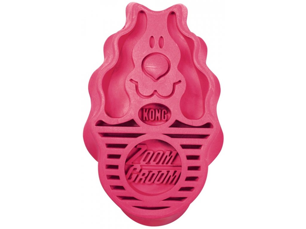 Patentovaný gumový hřeben ZoomGroom je vedle legendárního „gumového sněhuláka“ jednou z největších stálic v sortimentu KONG. Díky svým dvoucentimetrovým gumovým zubům kuželovitého tvaru pronikne i dlouhou a hustou srstí, a může tak nejen účinně vyčesávat línající chlupy, ale také šetrně masírovat pokožku a tím podporovat její prokrvení a přirozenou tvorbu kožního mazu. Funguje stejně dobře nasucho jako zamokra a při koupání usnadňuje aplikaci i vymývání šamponu. Rukojeť má ergonomicky tvarované okraje pro pevnější úchop.