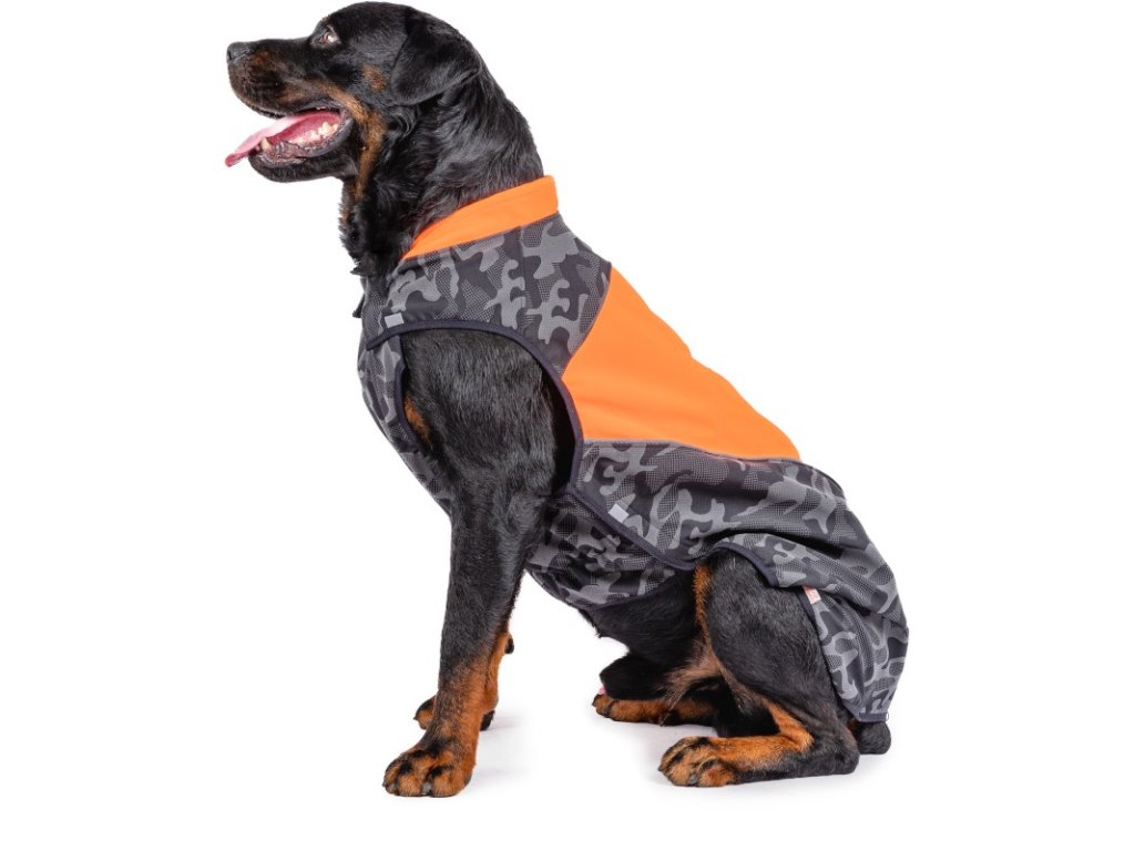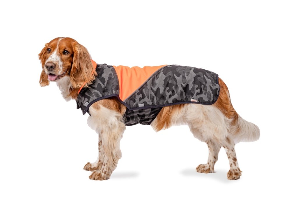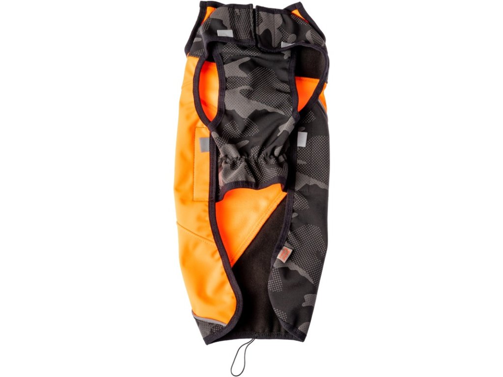 Funkční softshellová vesta Splendor chrání psa před chladem, větrem i deštěm. Vysoce kvalitní třívrstvý softshell má nejen vynikající termo- a hydroizolační vlastnosti, ale také vysokou prodyšnost a elastičnost. Střih je navržen anatomicky tak, aby psa neomezoval v pohybu, a přitom chránil všechny důležité partie jeho těla. Okraje vesty jsou obšité pružným lemem, takže obleček výborně drží na těle psa, nepodfukuje a neuniká zpod něj teplo. Gumičky na zadní nohy a ocásek zajišťují, aby vesta neodstávala v zadní části. Za krkem je otvor pro připnutí vodítka a všité poutko pro zavěšení (např. při sušení). Oblékání je snadné a rychlé díky systému suchých zipů: oboustranné zapínání pod krkem umožňuje optimální nastavení obvodu krční části a zipy na bocích umožňují zapnutí břišní části zleva i zprava. Pro bezpečnější venčení za zhoršené viditelnosti je vesta opatřena reflexními prvky.