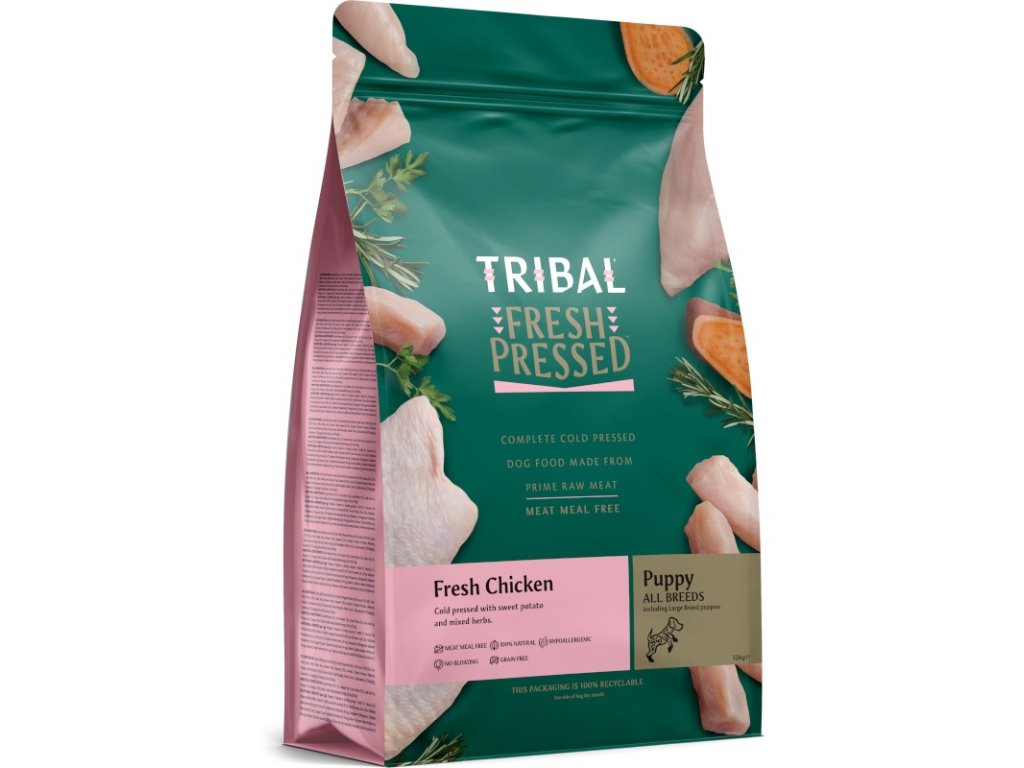 Receptura TRIBAL Fresh PressedTM Puppy Chicken obsahuje 56 % čerstvého kuřete, ryb a vajec + batáty, směs bylin a mnoho dalších hodnotných ingrediencí. Určená je především pro štěňata.